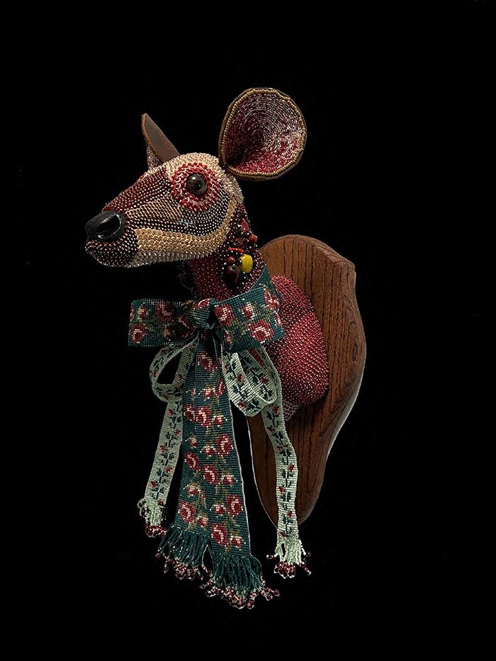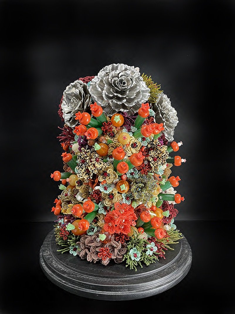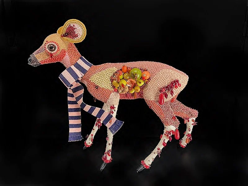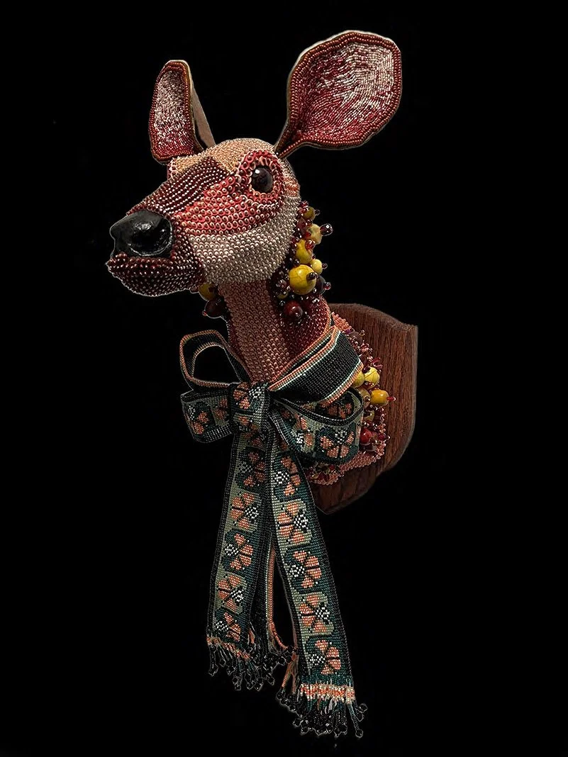 Gayla Partridge’s current work focuses on transforming traditional anatomical subjects, particularly human skulls and animal forms, into captivating works of art through intricate beadwork. She utilizes glass beads, shells, and semi-precious stones along with French beading techniques to create pieces harking back to Victorian dome art. Her current work showcases a high level of craftsmanship and attention to detail while evoking themes of life, death, and transformation.