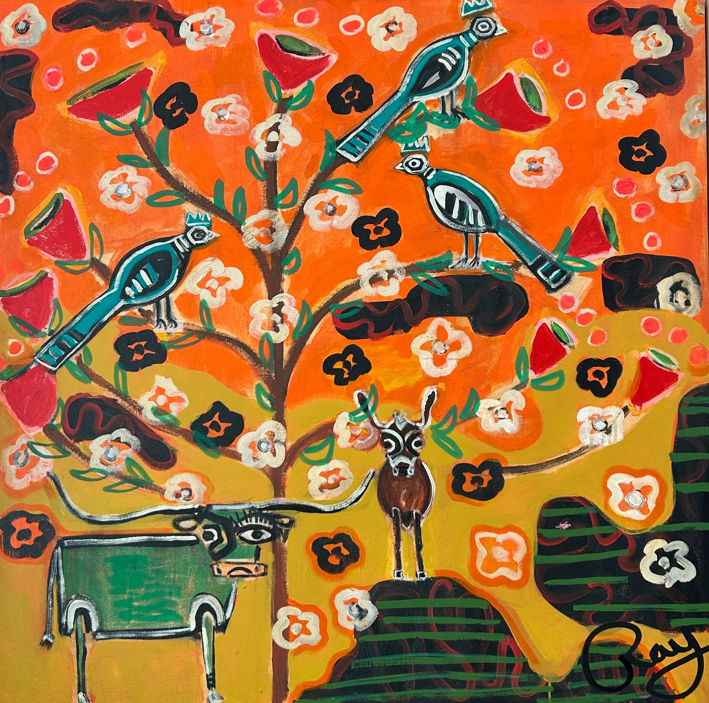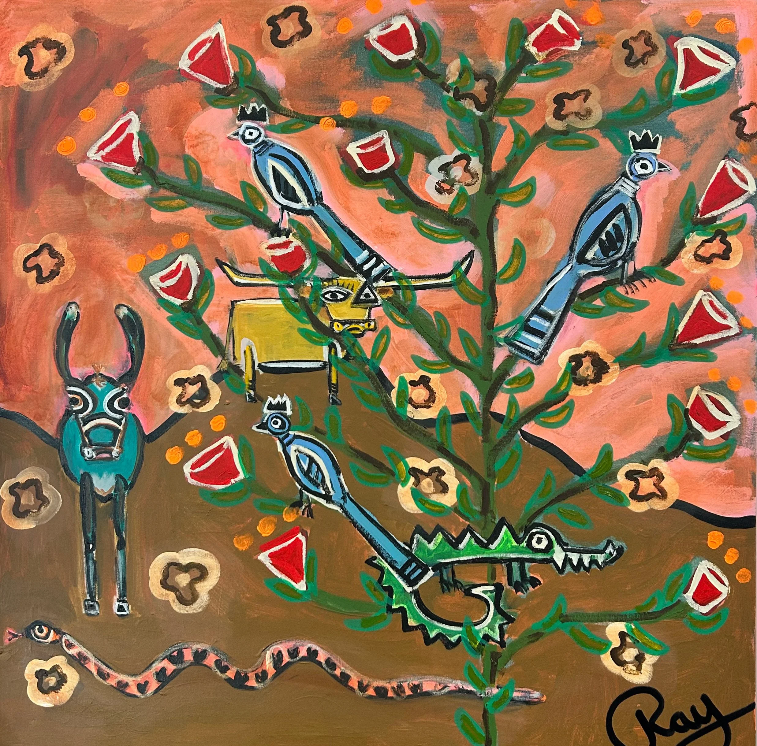 Ray Hadaway is a self-taught artist based in Texas. His charming artworks blend various media and techniques drawing inspiration from the beauty of nature and his travels. With clever use of color, texture, and composition, Ray’s art evokes joy and resonates with people from all walks of life. Inspired by artists, such as Vincent Van Gogh, Pablo Picasso, and Jean-Michel Basquiat, Ray calls his unique approach a contemporary folk fusion with a Texas twist.